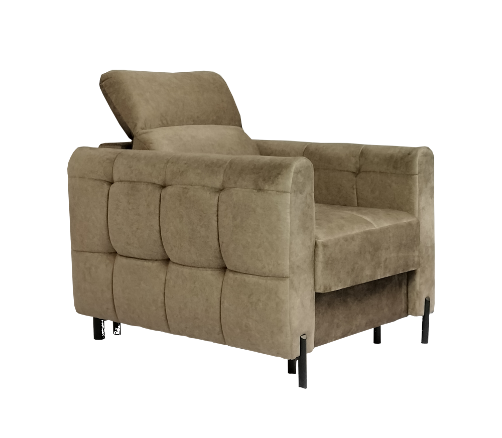 Bryła mebla prezentuje nowoczesną, uporządkowaną linię. Detale tapicerskie (podziały, przeszycia oraz kształt poduszek)