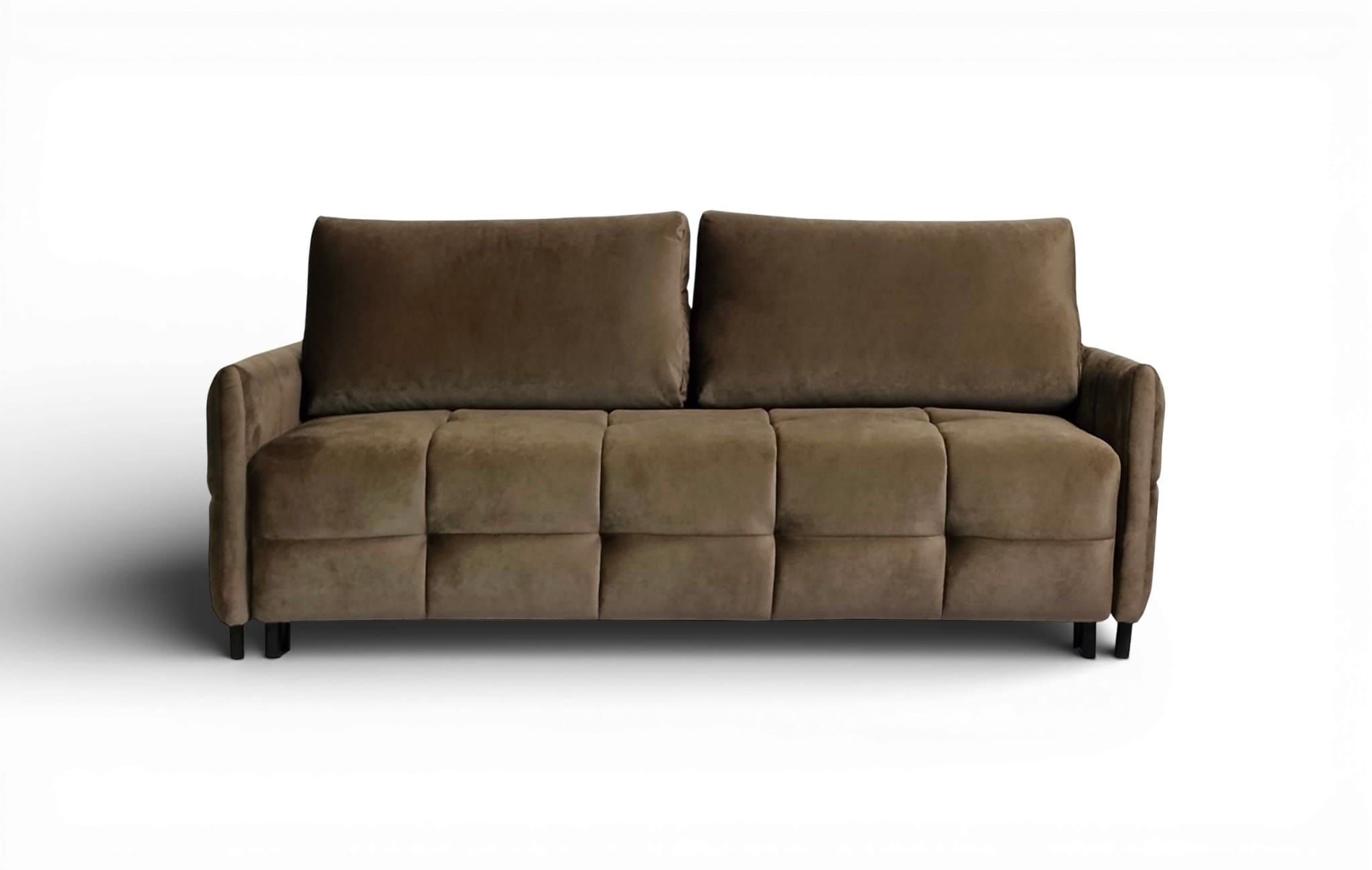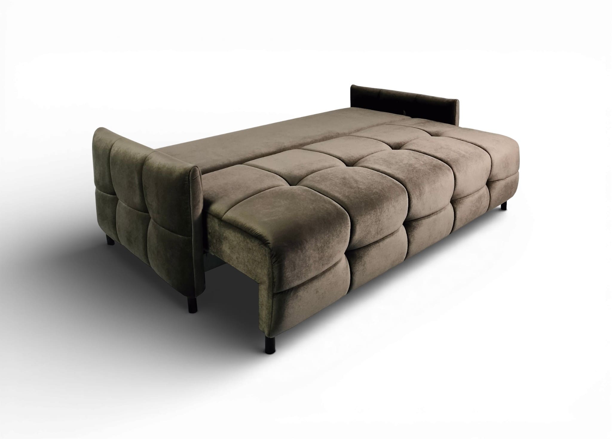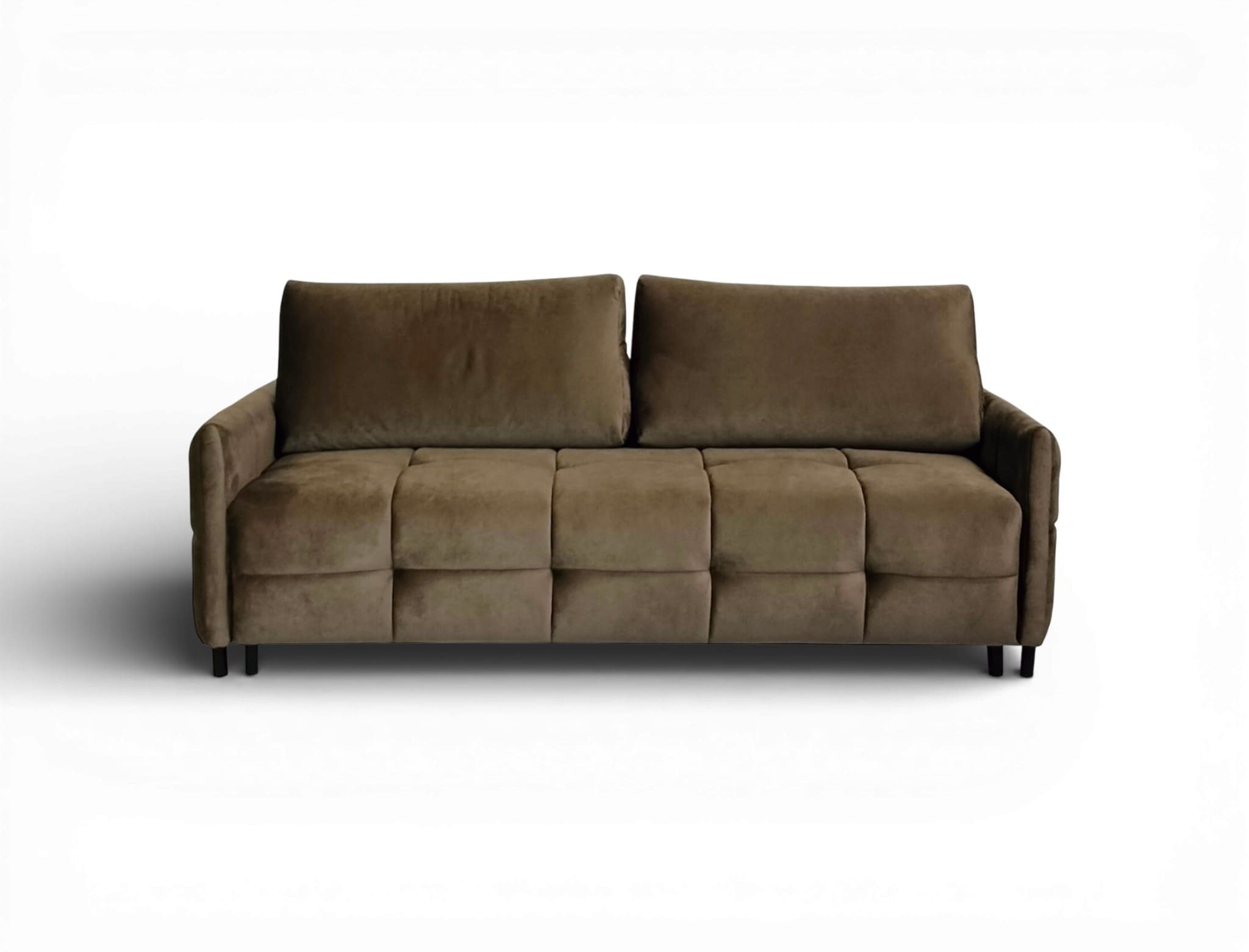 Kanapa charakteryzuje się prostą, nowoczesną formą oraz wyraźnie zaznaczonymi