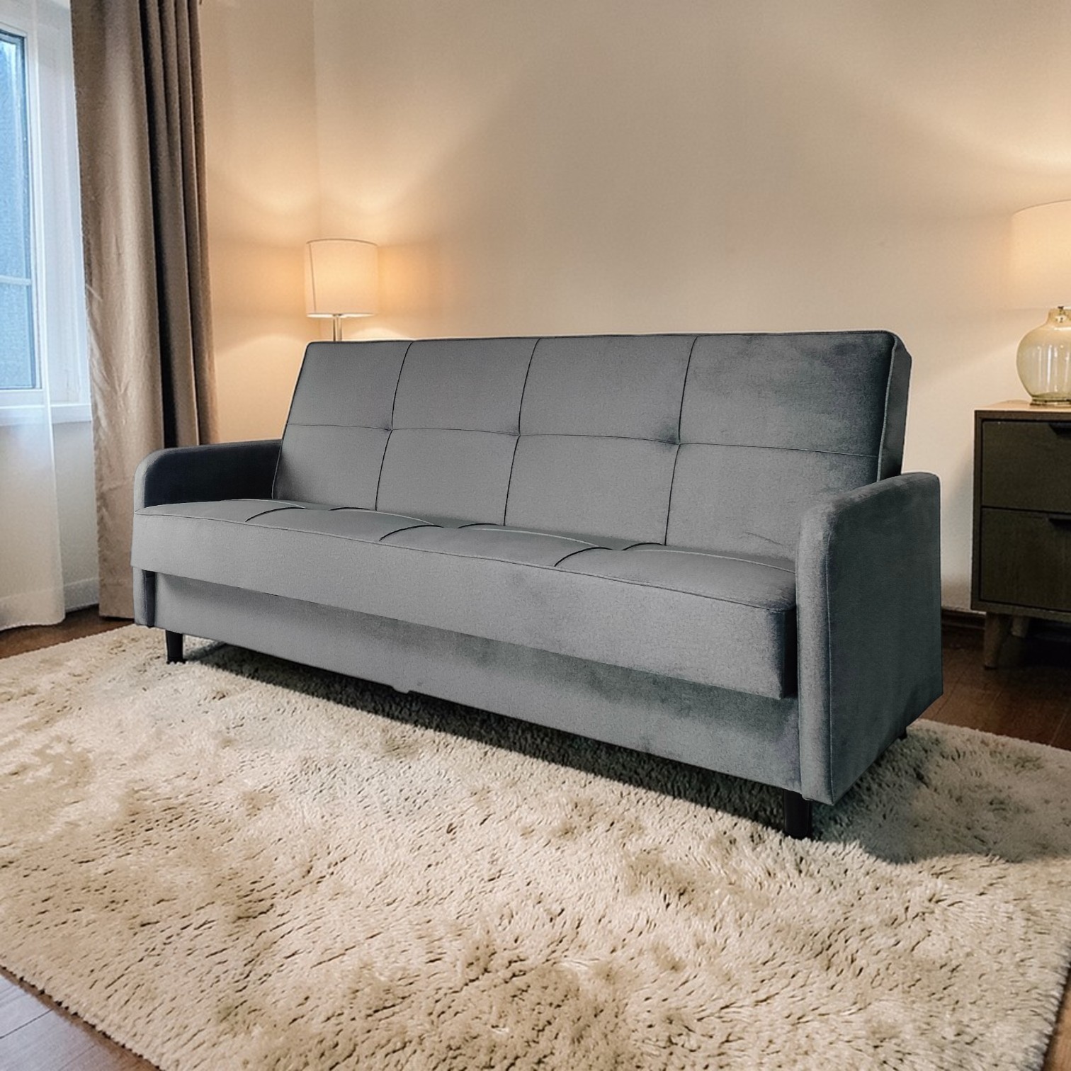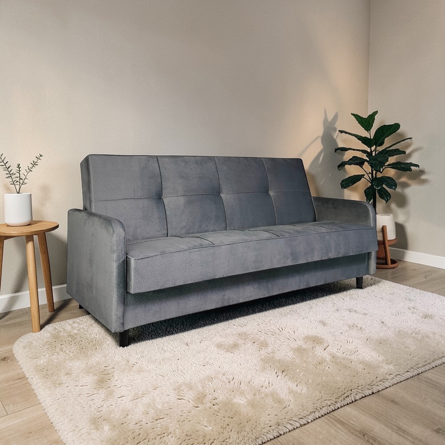Bryła mebla prezentuje nowoczesną, uporządkowaną linię. Detale tapicerskie (podziały, przeszycia oraz kształt poduszek)